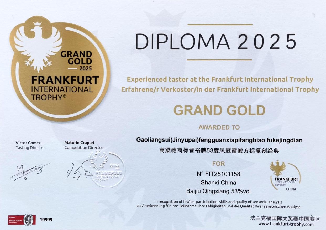 圖十八:2025年10月「高粱穗商標晉裕」牌白酒獲法蘭克福2025國際大獎賽「大金獎」獎狀